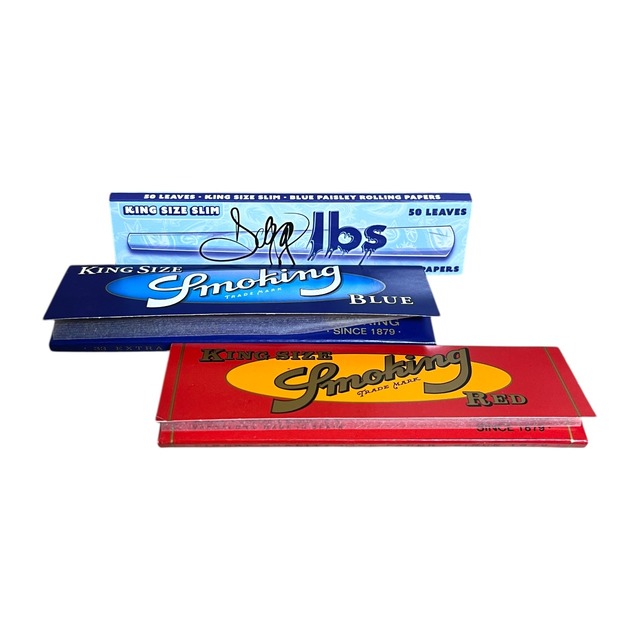 【商品説明】 撮影サンプルとして使用した、Snoop Doggプロデュースの Dogg lbs Blue Paisley を含む、 人気のブルー系ペーパーを中心にしたKing Sizeセットです。海外ブランドをまとめて試したい方や、紙質の違いを楽しみたい方にぴったり。 ※ 撮影に使用したサンプル品のため開封済みです。 【商品詳細】 Dogg lbs Blue Paisley / King Size Slim(キングサイズスリム) Smoking Blue / King Size(キングサイズ) Smoking Red / King Size(キングサイズ) 状態:撮影サンプル(微細な使用感あり)